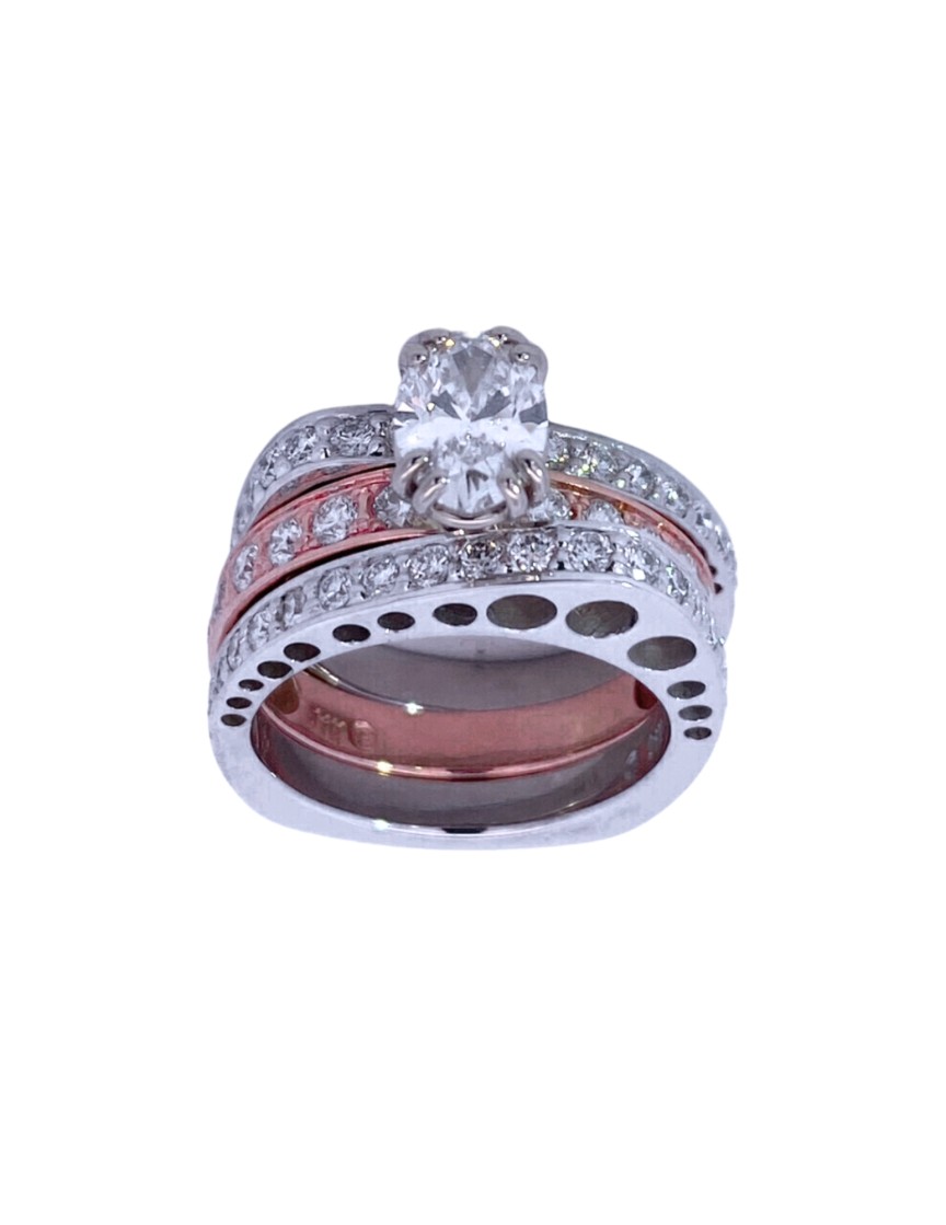 This gorgeous set was made by our in house jewelers! It has a 2.23cttw with beautiful center stone set in 14k rose gold and two 14k white gold bands. A truly one-of-a-kind set!