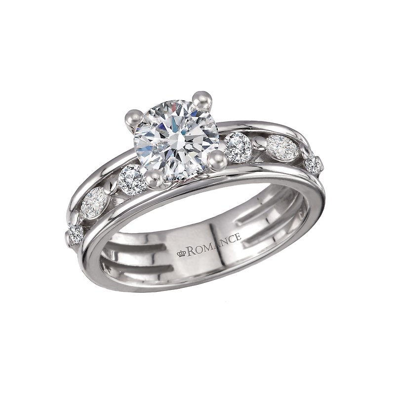 Crafted in 14K white gold, this semi-mount ring features a delicate three-row design accented with sparkling diamonds totaling 1/3ctw. The prongs are waiting for the center diamond to complete this ring. Center stone is not included in price!
