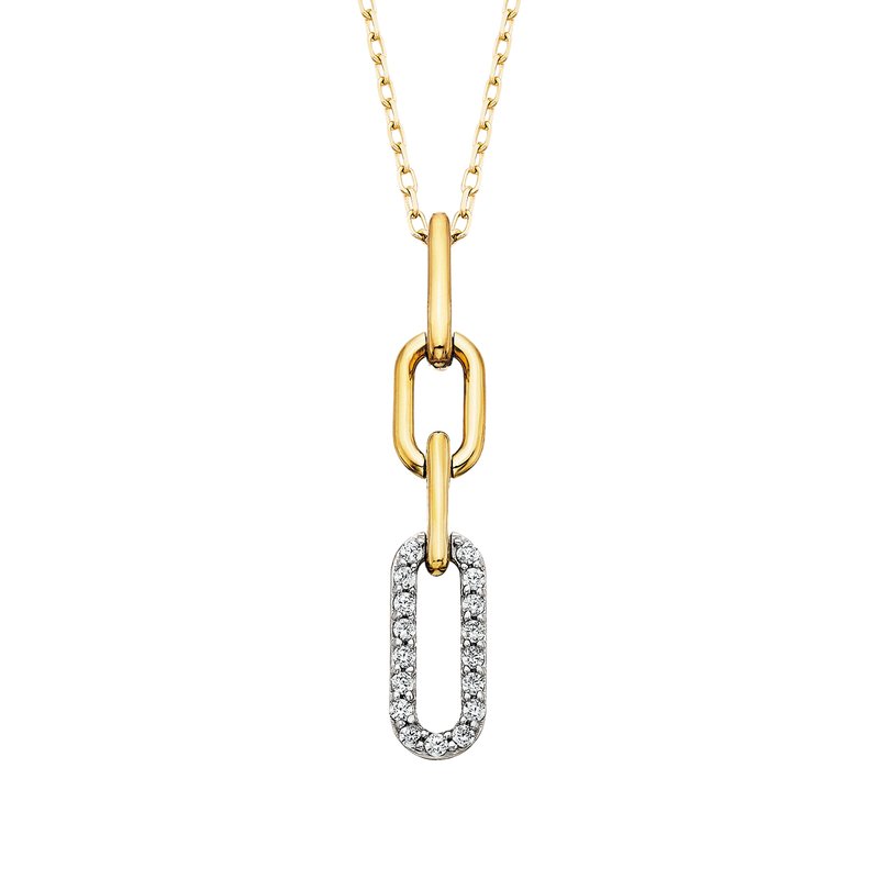 Elevate your look with this striking 10k yellow gold paperclip pendant. Delicate diamonds totaling 0.10cttw provide a touch of sparkle to this modern and sophisticated design.