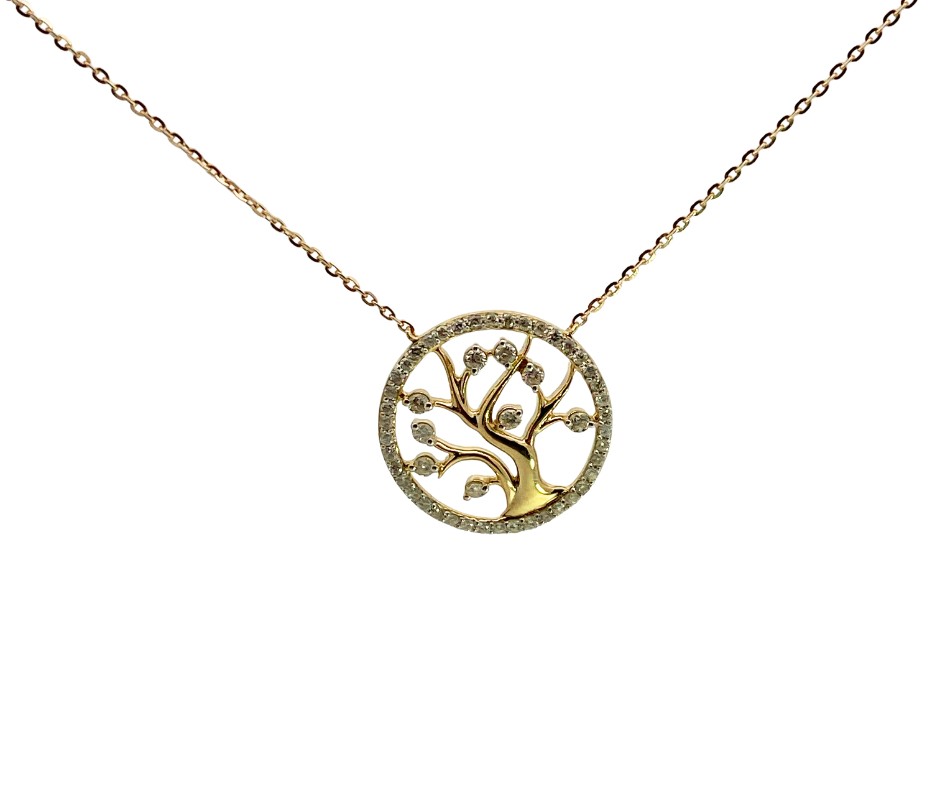 Embrace the beauty of life with this stunning 10k yellow gold pendant. The intricate “Tree of Life” design is adorned with shimmering diamonds, totaling 0.30 carats, creating a meaningful and elegant piece.