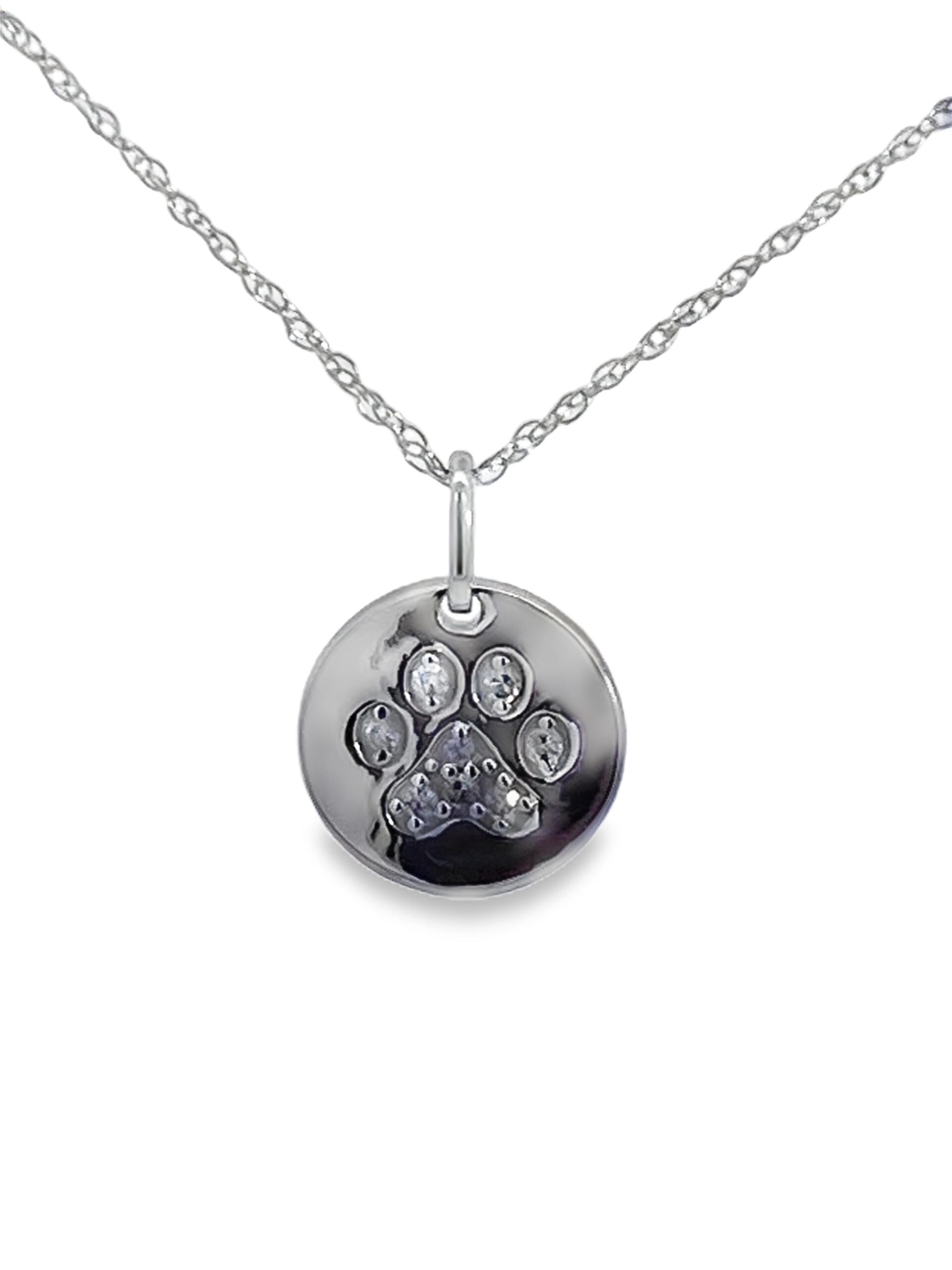 Show your love for your furry friend with this adorable 10K white gold pendant necklace. Featuring a disc pendant with a diamond-accented paw print, this necklace is the perfect accessory for any animal lover.