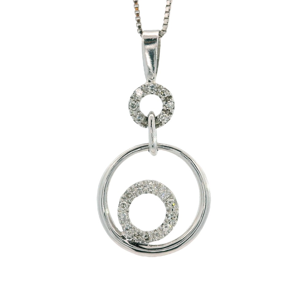 Adorn yourself with this elegant 14k white gold pendant. A modern design features two shimmering circles, each delicately encrusted with .11 ct.tw. of sparkling diamonds. A captivating piece to elevate any ensemble.