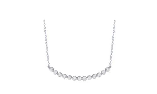 This elegant pendant features a 14k white gold smile bar adorned with 1/2ct.tw. of shimmering diamonds. Comes with a 16″ chain. The perfect gift for any special occasion!