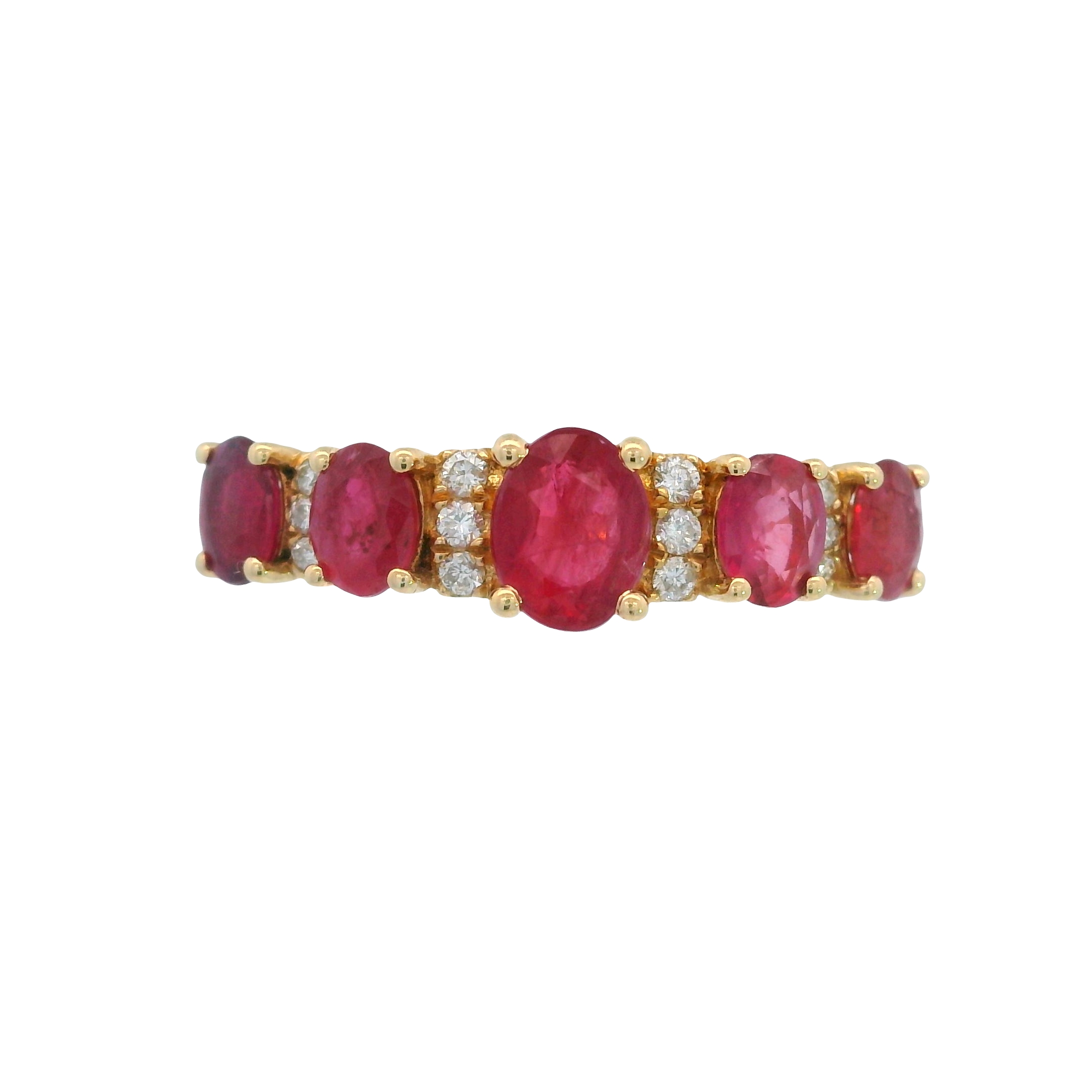 This stunning 14k yellow gold ring features five vibrant rubies elegantly accented by 0.07 TDW of sparkling diamonds. Combining classic sophistication with a pop of brilliant color, this timeless 5-stone band is a perfect choice for anniversaries or a luxurious addition to any fine jewelry collection.