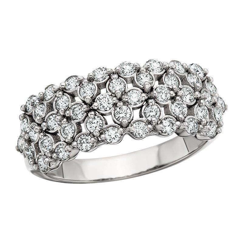 Celebrate your love with this stunning wedding or anniversary band from BERCO. This 14KW gold ring features a dazzling .88ctw diamond floral cluster, creating a breathtaking display of brilliance and elegance. A timeless treasure!