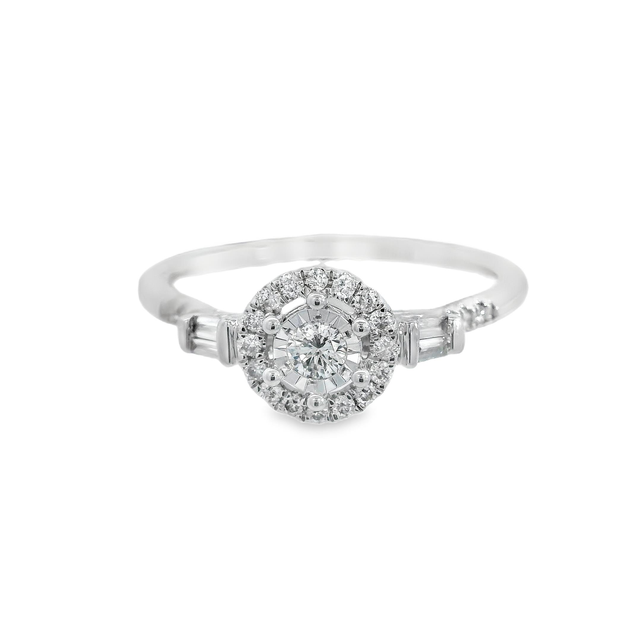Sparkle with this BERCO JEWELRY CO halo engagement ring. Featuring a .08ct center diamond surrounded by a shimmering halo. Crafted in 14k white gold, this ring totals .17tw. A stunning choice for your unforgettable moment!