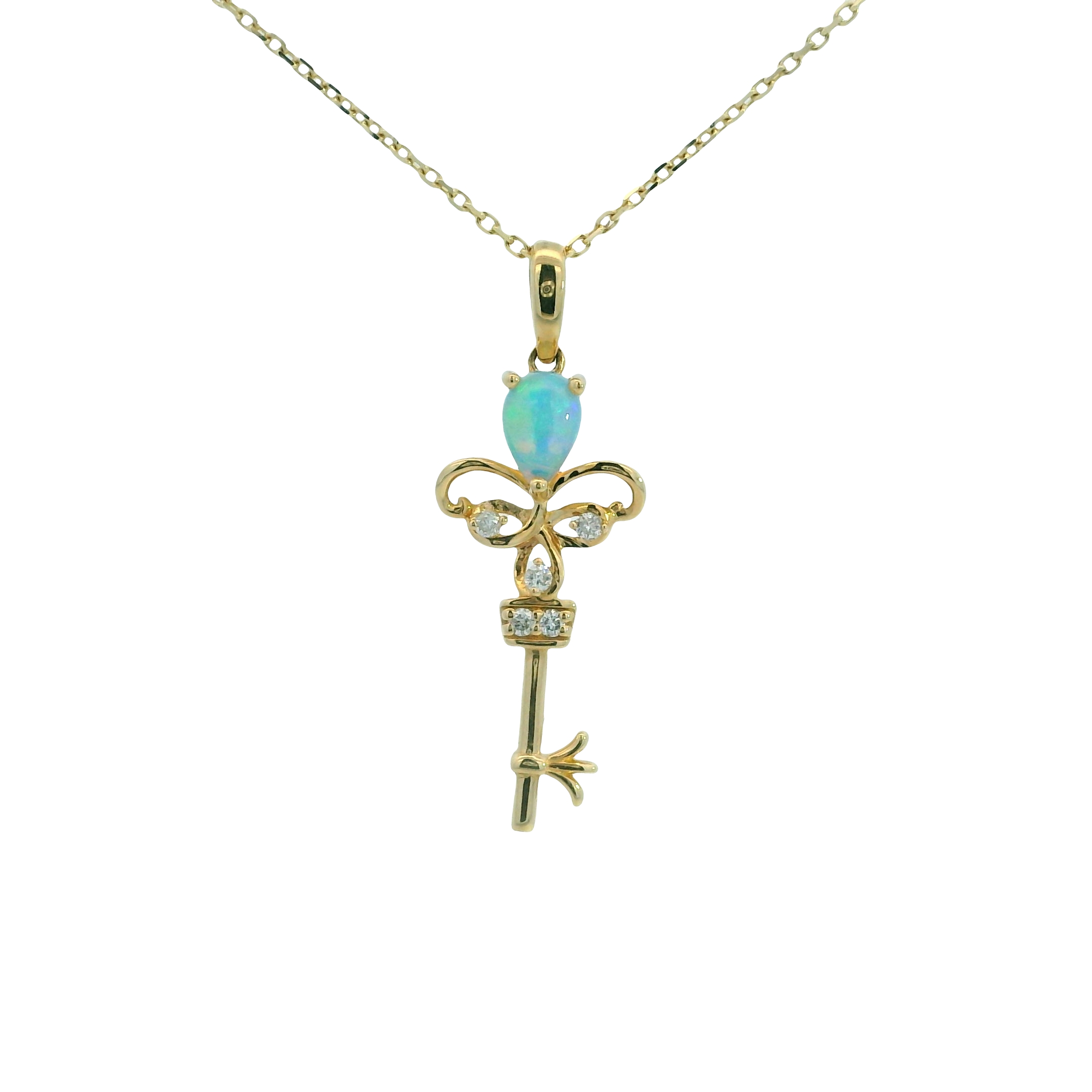 Unlock elegance with this stunning 14k yellow gold key pendant. Featuring a vibrant Ethiopian opal that shimmers with iridescent color, it is beautifully accented by sparkling diamonds. Complete with an 18-inch chain, this whimsical piece is the perfect treasure to celebrate a special milestone.
