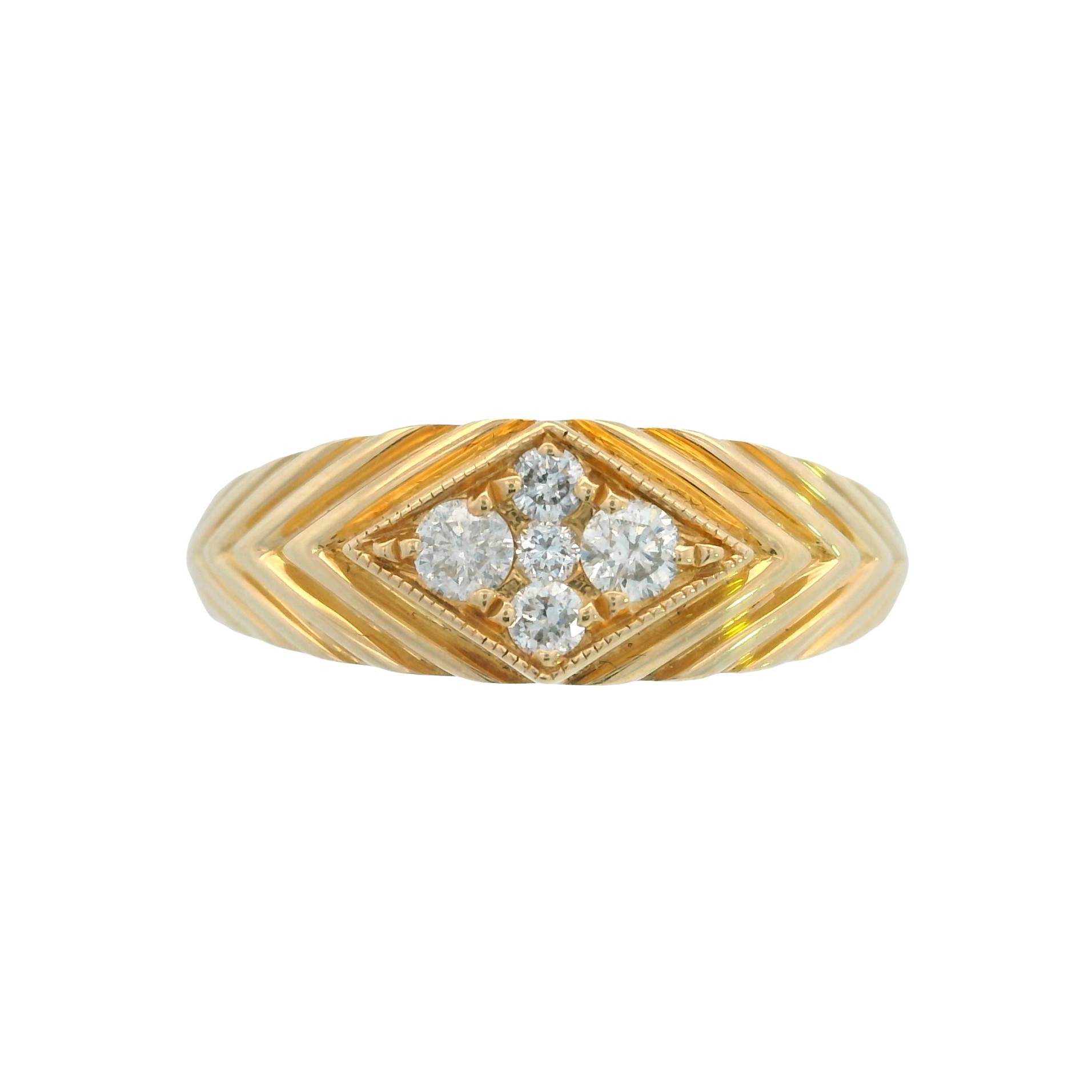 Add a touch of timeless brilliance to your hand with this 14k yellow gold patterned ring. Featuring five shimmering diamonds totaling .21 carats, the intricate geometric band beautifully highlights the central diamond cluster. This elegant, textured piece is perfect for daily wear or as a sophisticated statement accessory.