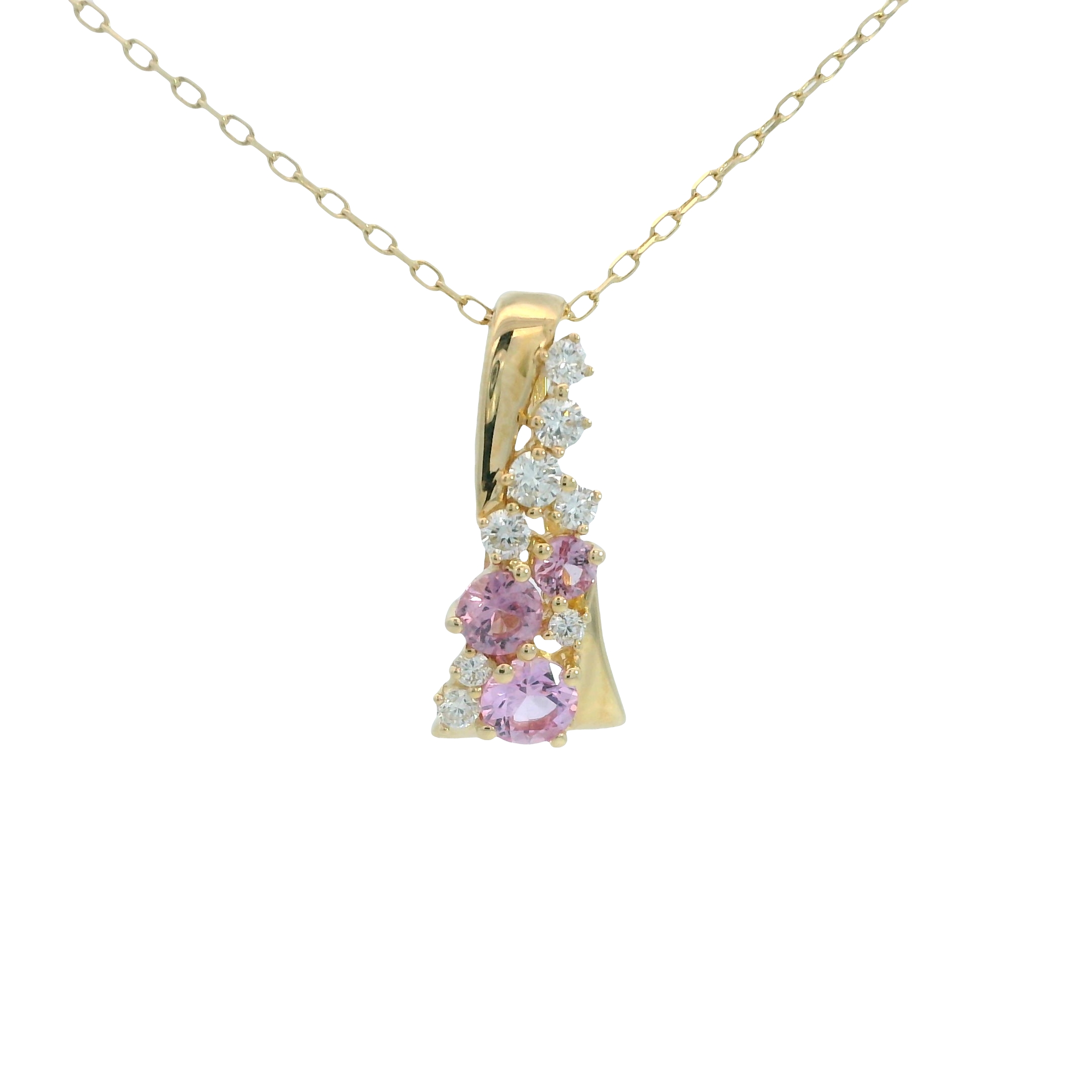 Radiant pink sapphires and .16 TDW of sparkling diamonds cascade elegantly in this 14k yellow gold waterfall pendant. Complete with a classic 18-inch chain, this stunning piece captures light and motion, making it a sophisticated addition to your jewelry collection for any occasion.