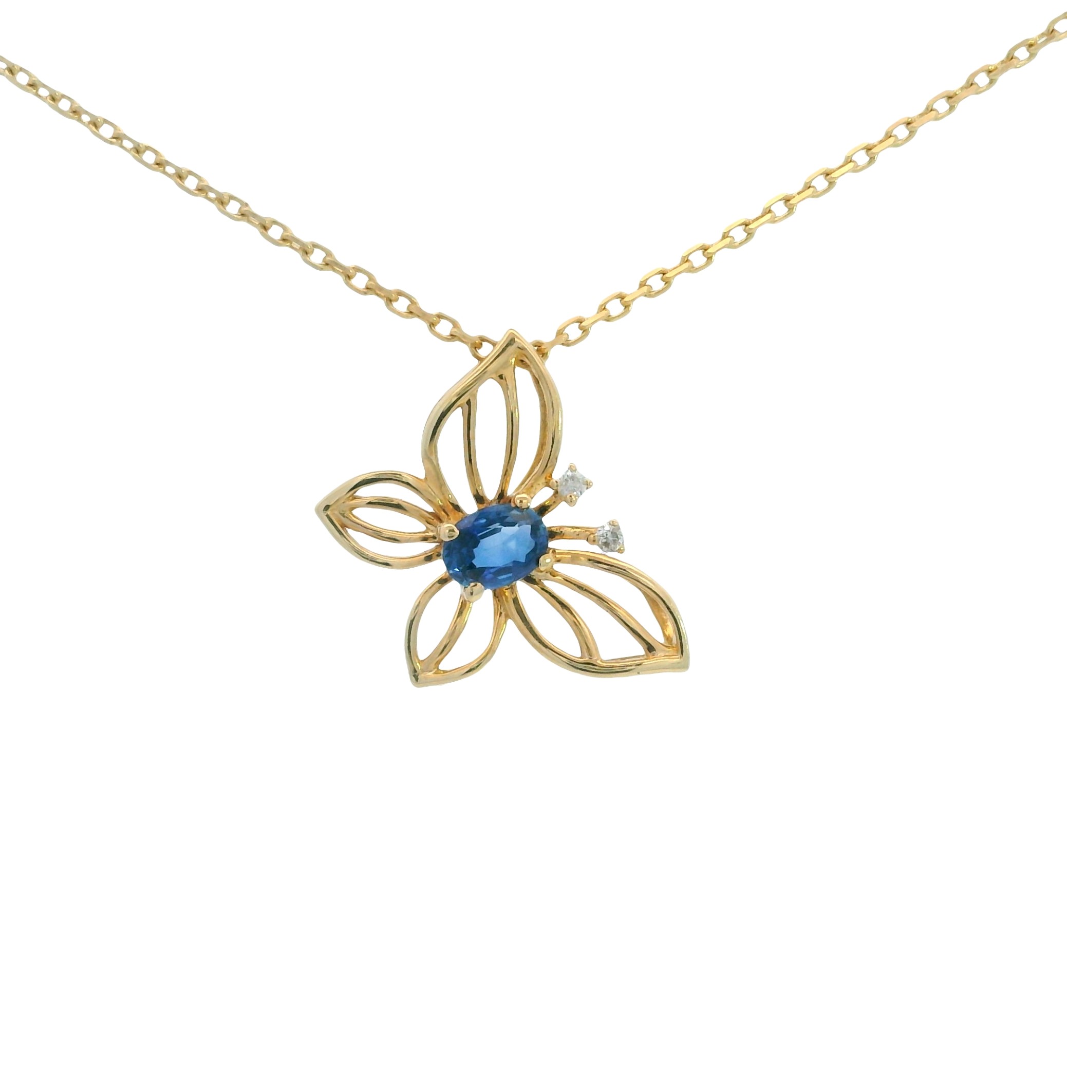 Embrace timeless elegance with this 14k yellow gold butterfly pendant. Featuring a vibrant oval blue sapphire centerpiece and delicate diamond accents, this charming piece captures the beauty of nature. Suspended from a classic 18-inch chain, it’s a sophisticated accessory perfect for adding a touch of grace to any ensemble.