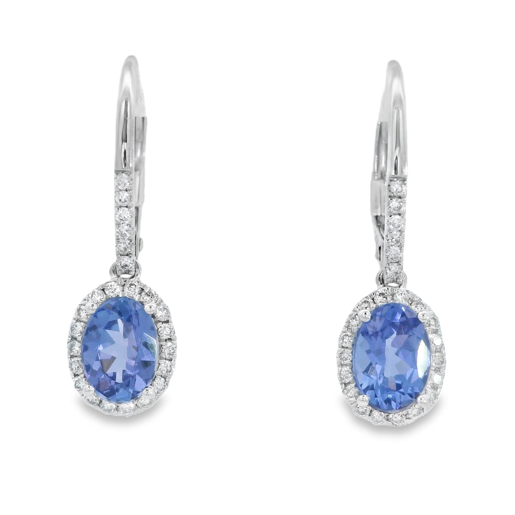 Enhance your look with these elegant earrings. They feature oval tanzanite stones embraced by a halo of sparkling diamonds. Set in 14KW gold, these delicate earrings add a touch of sophistication to any outfit.