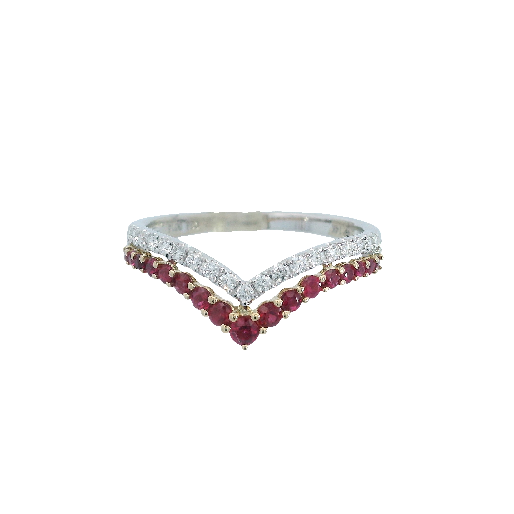 Make a statement with this stunning 14kt two-tone chevron ring. Featuring a vibrant row of round rubies and a dazzling row of diamonds, this ring is beautiful on its own or stacked with a pear shape solitaire.