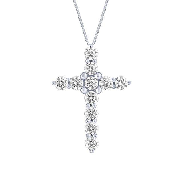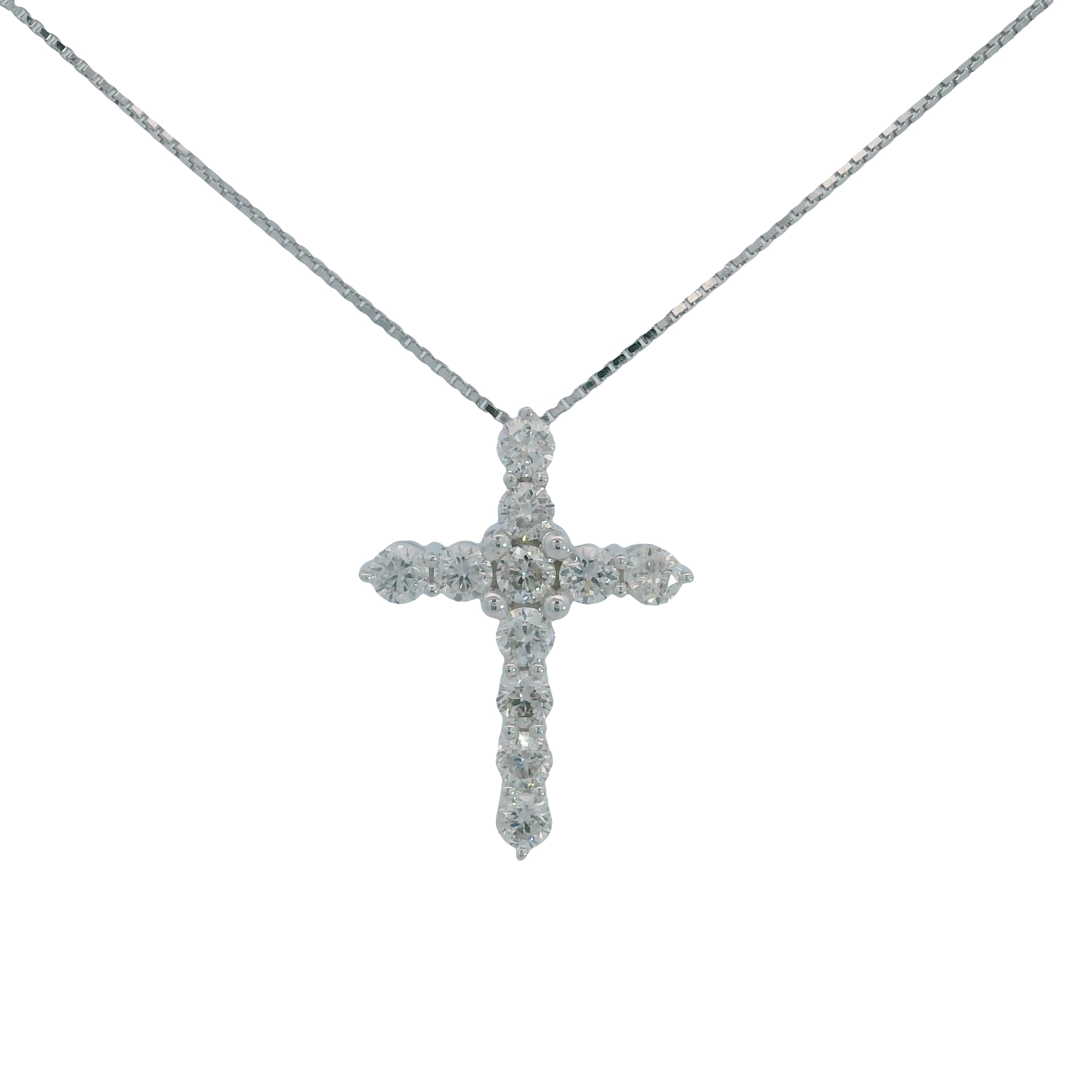 Adorn yourself with faith and elegance with this exquisite 14k white gold diamond cross pendant. Featuring 1/2 ct.tw. diamonds, this timeless piece hangs gracefully from an 18″ white gold box chain. Also available in 1/4ct.tw. and 1ct.tw. options.