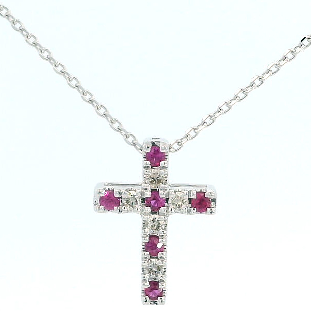 Adorn yourself with this elegant 14K white gold cross pendant. Featuring vibrant rubies and sparkling diamonds (1/10 ctw each), this beautiful necklace is a timeless expression of faith and style.