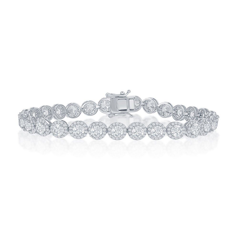 Sparkle with this elegant 7.5″ tennis bracelet. Crafted in sterling silver, this piece features dazzling round cubic zirconia stones set in a shimmering halo design. Perfect for adding a touch of glamour to any look.