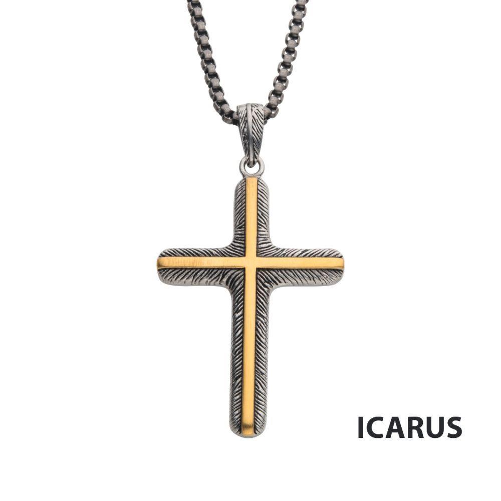 This stainless steel pendant features a gold-plated inlay cross. It hangs from a 24-inch chain, making it a bold and stylish statement piece.