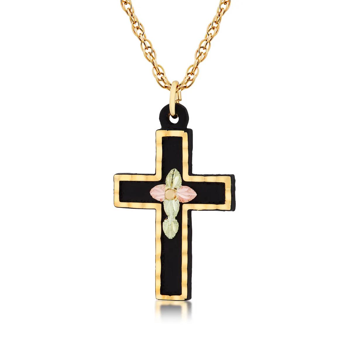 This striking Black Hills necklace features a powder-coated silver pendant with intricate detailing and a gold-filled chain. The contrasting colors create a bold, unique piece that will add a touch of elegance to any outfit.