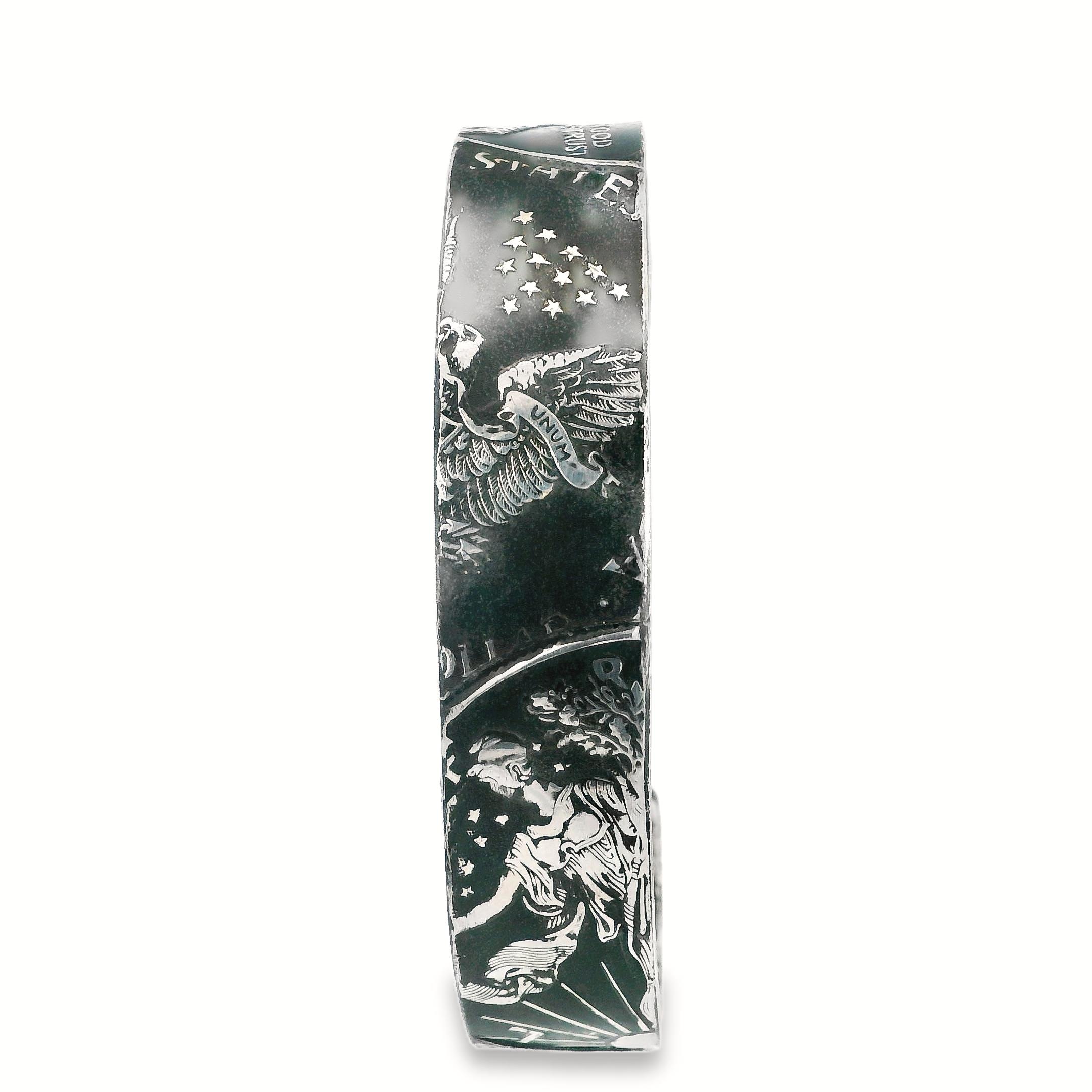 Showcase your patriotism with this unique bangle. Brady Posey’s silver coin bangle features the iconic Silver Eagle coin design, a stunning addition to any jewelry collection. It’s the perfect statement piece.