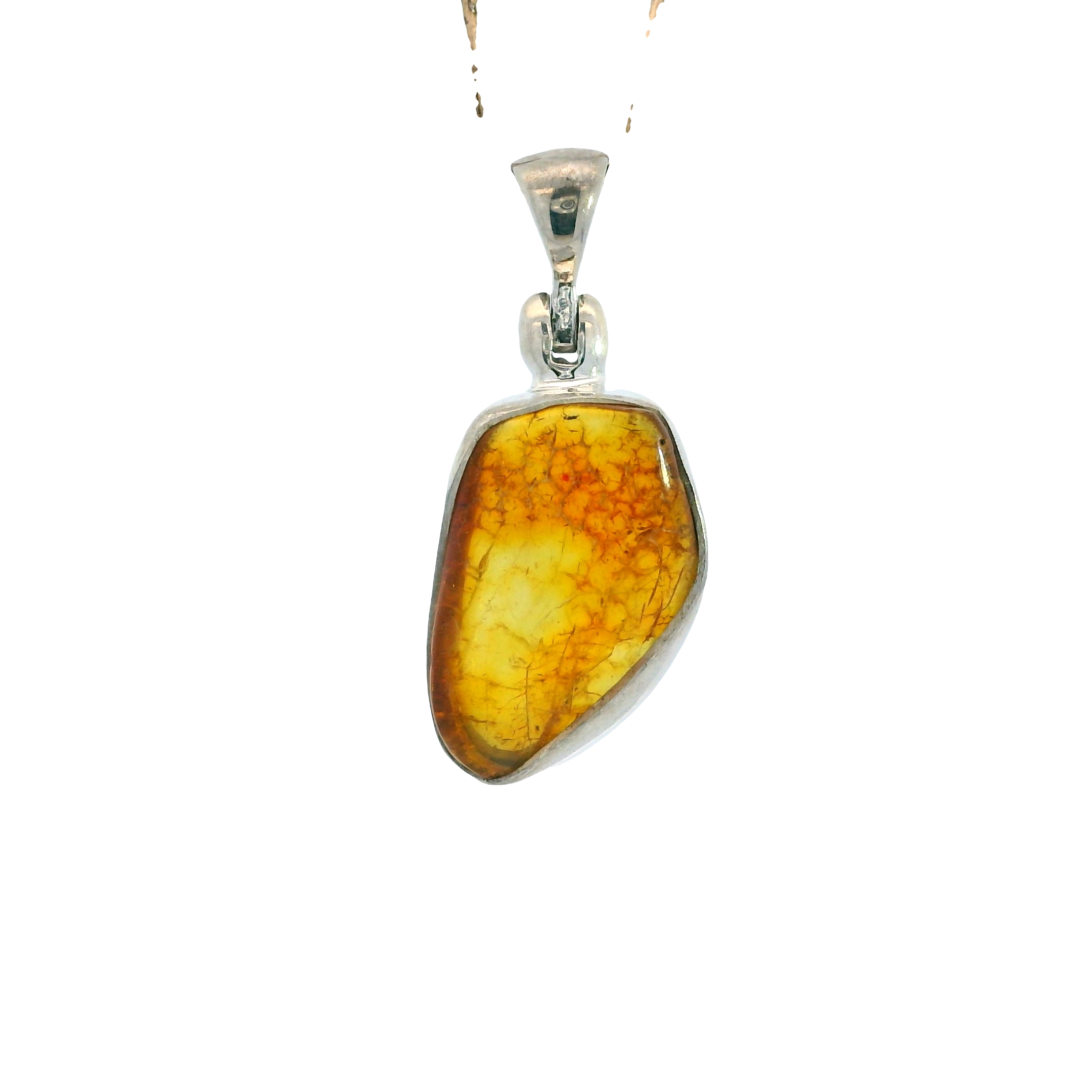 Embrace natural beauty with this stunning sterling silver amber pendant. Featuring a freeform honey-colored stone with unique internal inclusions, this organic piece captures warm, earthy elegance. Suspended from a sleek silver bail, it’s a versatile addition to any collection, perfect for adding a radiant glow to your everyday look.