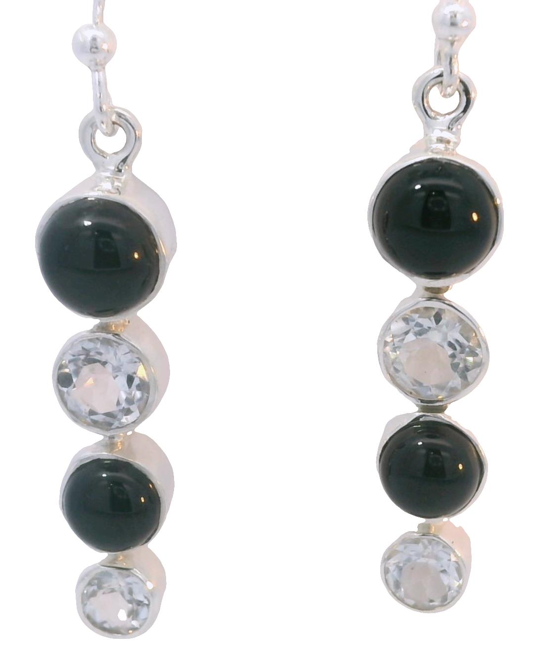 Elegant sterling silver earrings featuring alternating vertical black onyx and white topaz stones. These 4-stone earrings offer a classic and sophisticated look, perfect for adding a touch of subtle glamour to any outfit.