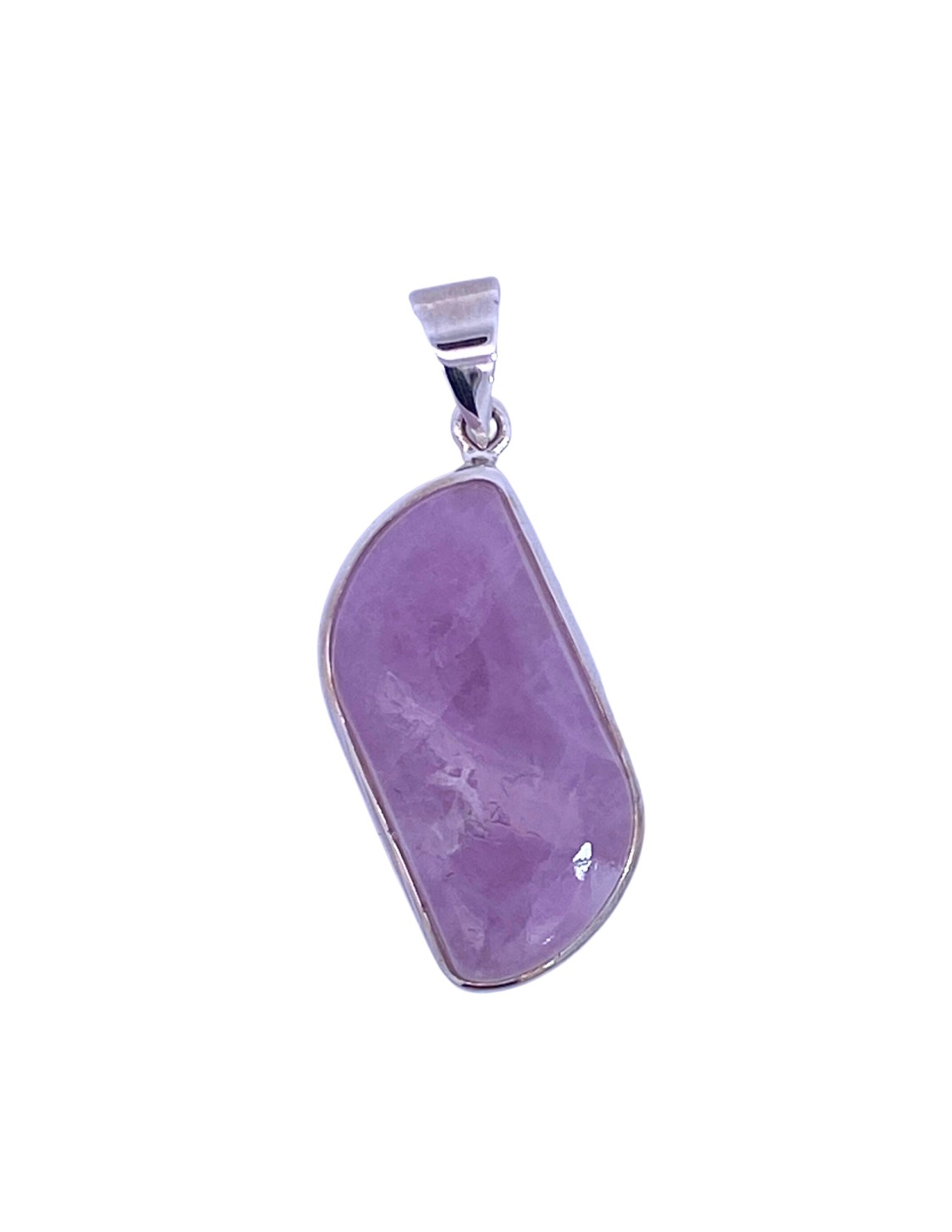 This pendant features a unique, offset oblong Kunzite gemstone set in sleek sterling silver. Its soft, alluring color will beautifully complement both silver chains and leather cords. A distinctive piece for any jewelry collection.