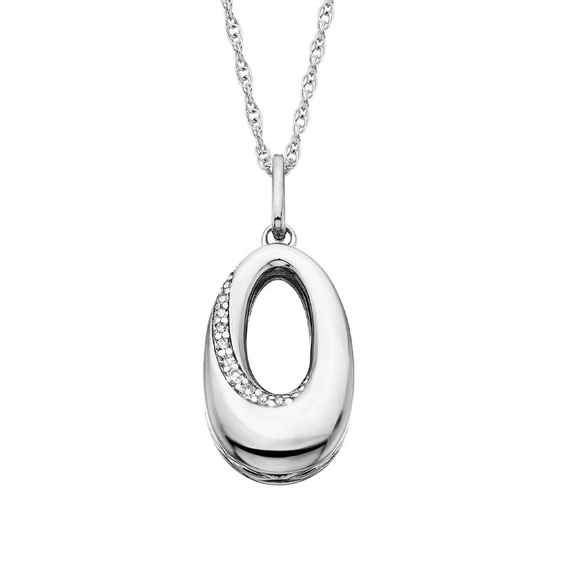 This RJO BERCO CHRISTMAS FLYER design features a polished sterling silver oval pendant. Sparkling diamonds, 0.06tw, accent the modern shape, adding a touch of brilliance to any outfit.