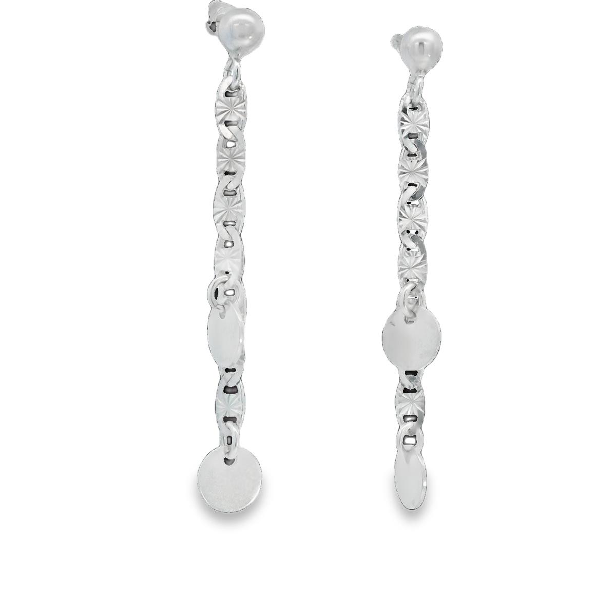 These dangle earrings from BERTKE BROTHERS LLC offer a chic, modern touch. The delicate, diamond-cut chain suspends polished discs, creating a graceful movement that catches the light. Perfect for adding a subtle sparkle to any look.