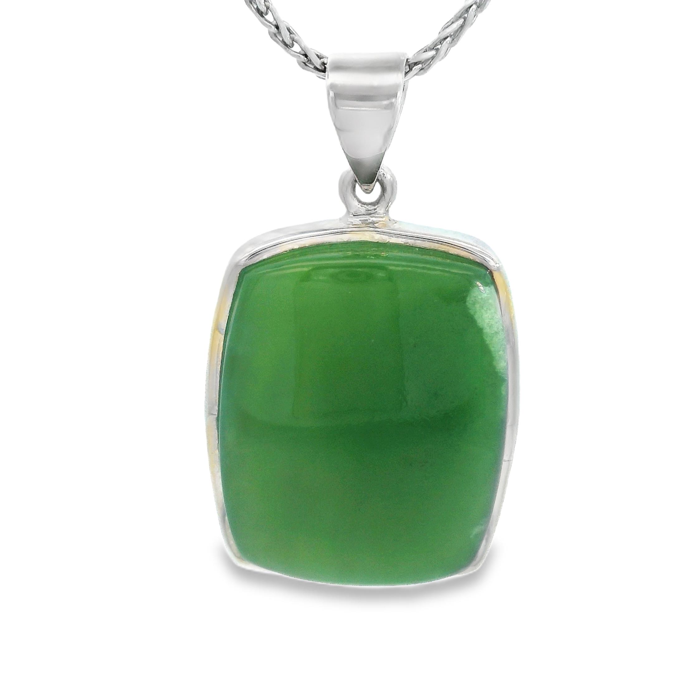 This Dan Cockrell design features a smooth, rectangular jade stone set in polished sterling silver. The vibrant green pendant offers a touch of natural elegance and effortless style to any look.