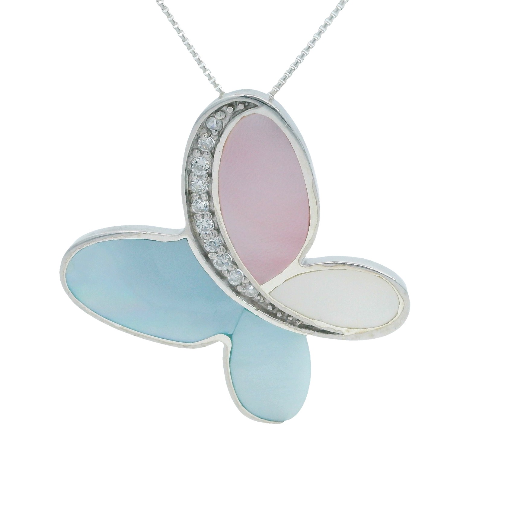 This charming pendant features a delicate butterfly design crafted from sterling silver and shimmering mother-of-pearl. A row of sparkling stones adds a touch of elegance to this whimsical piece.